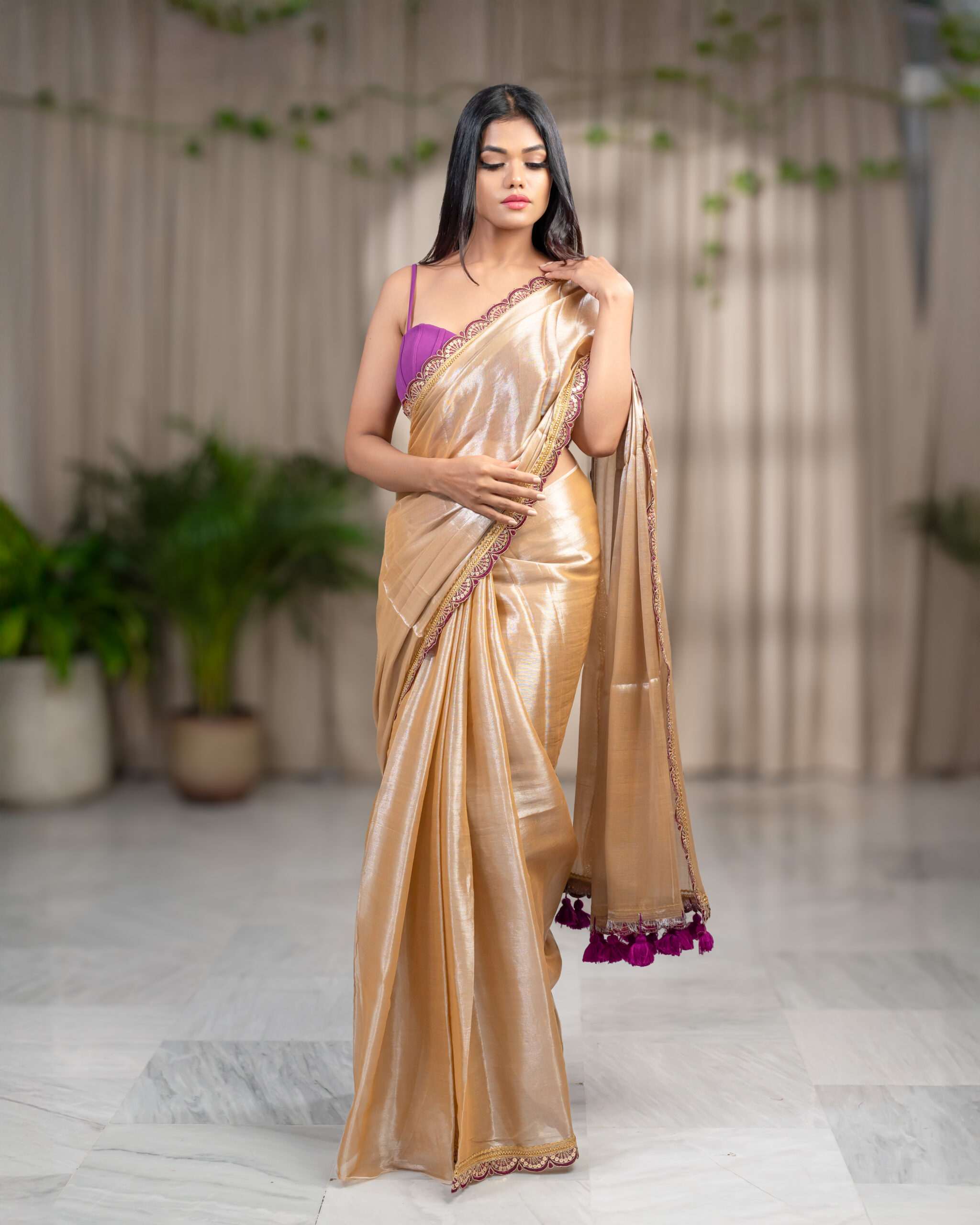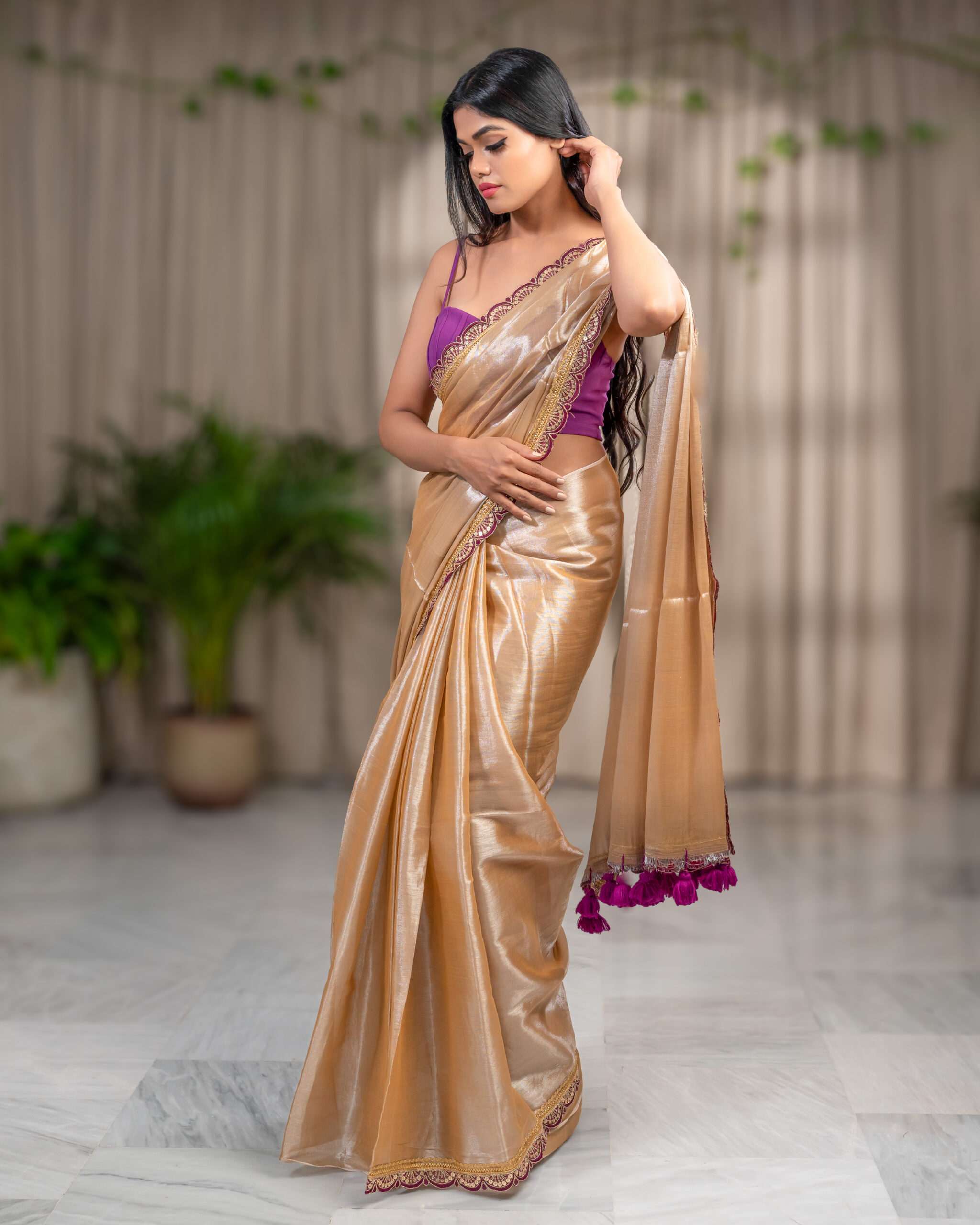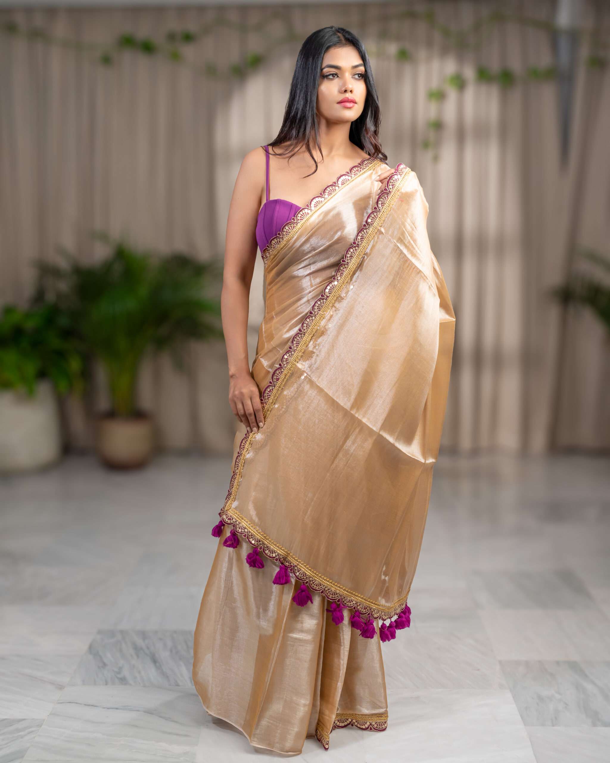 Indulge in the luxurious feel of our Plain Raga Tissue Saree. This stunning piece, crafted from the finest raga tissue, showcases a radiant golden hue, accented by a captivating purple lace border and big pom-poms.