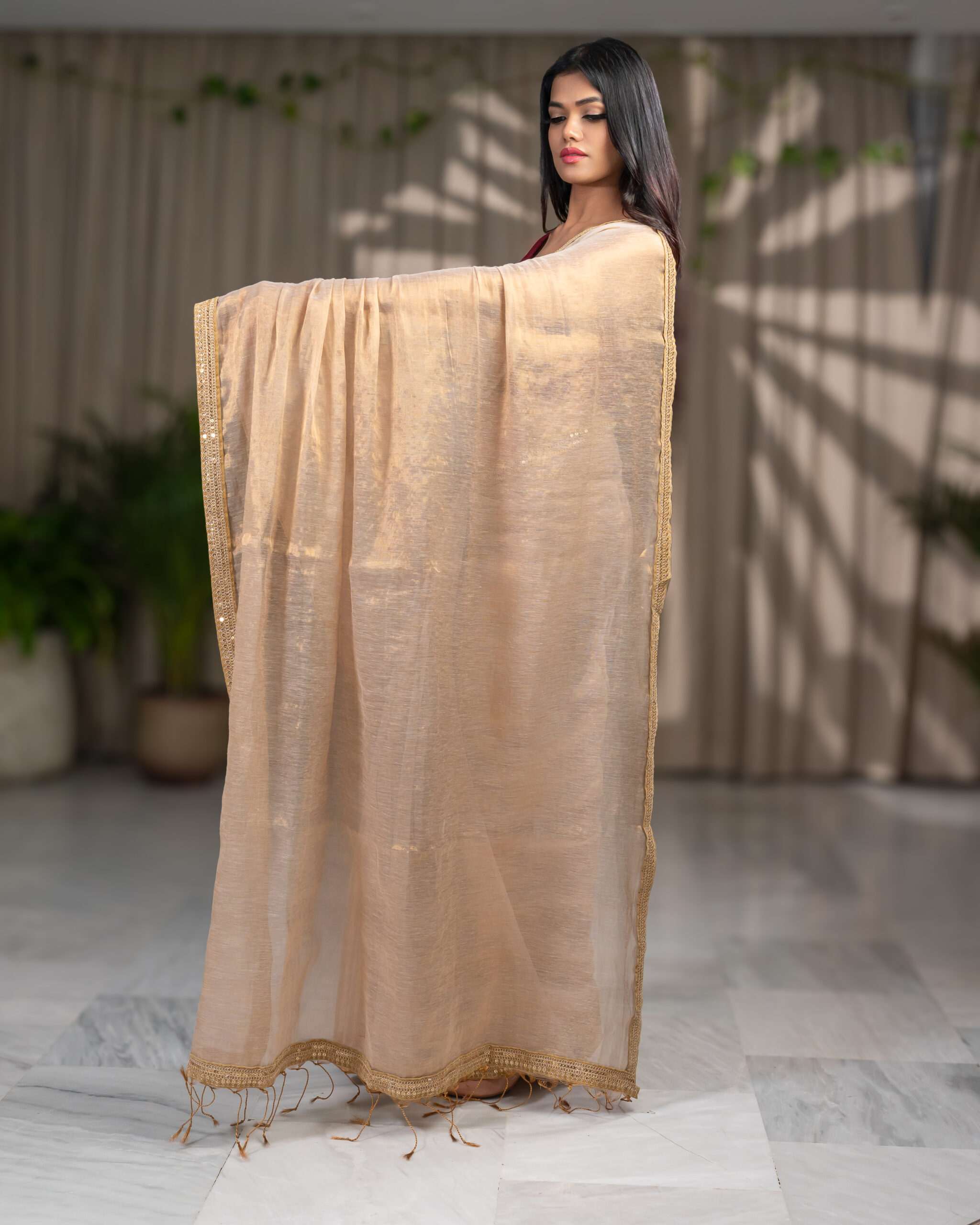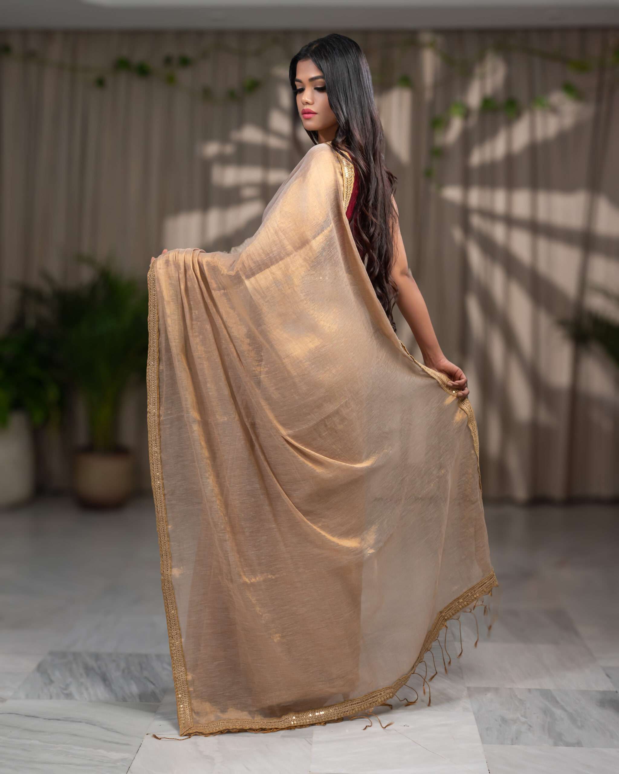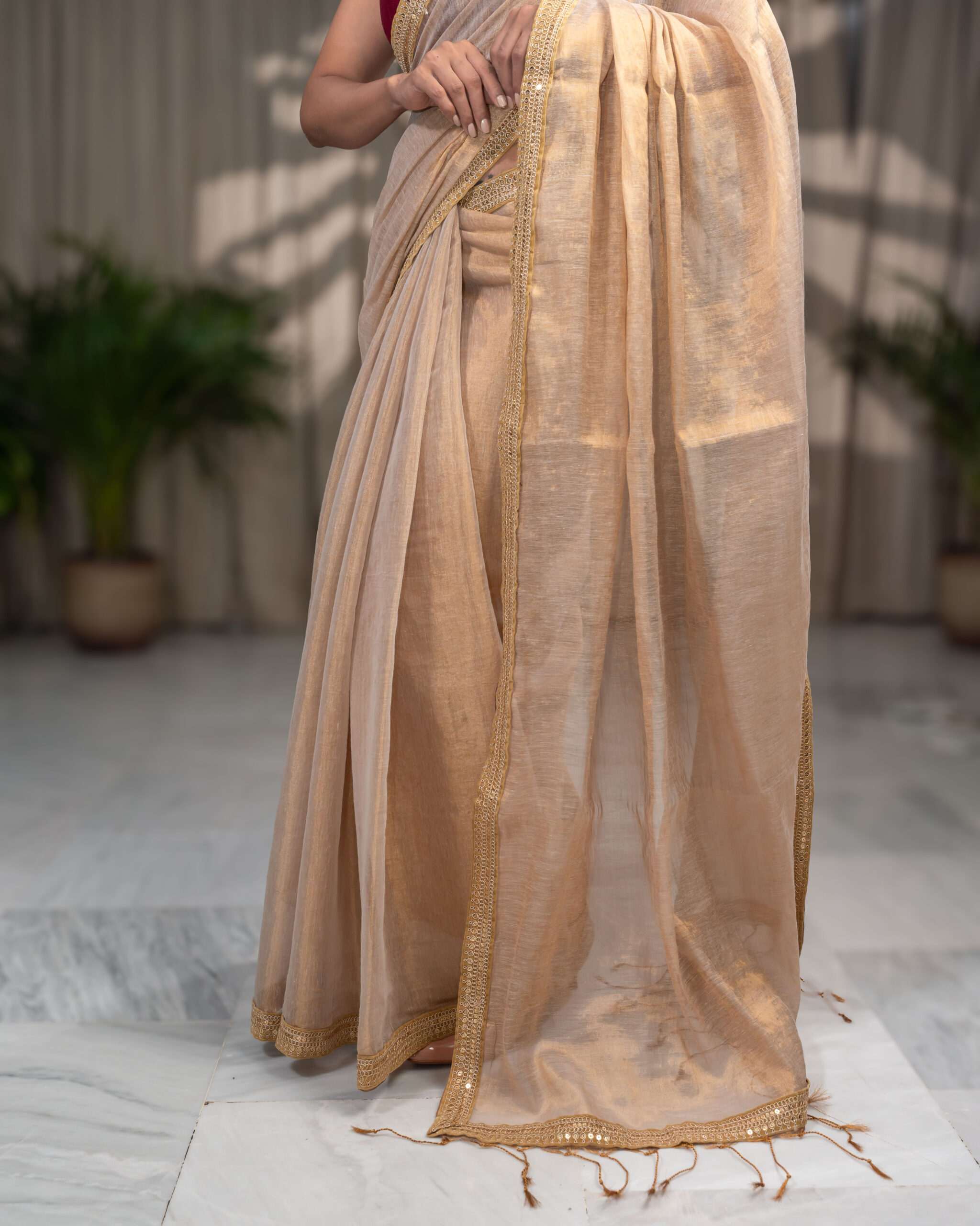 Golden Elegance: Raga Tissue Saree with Golden Lace