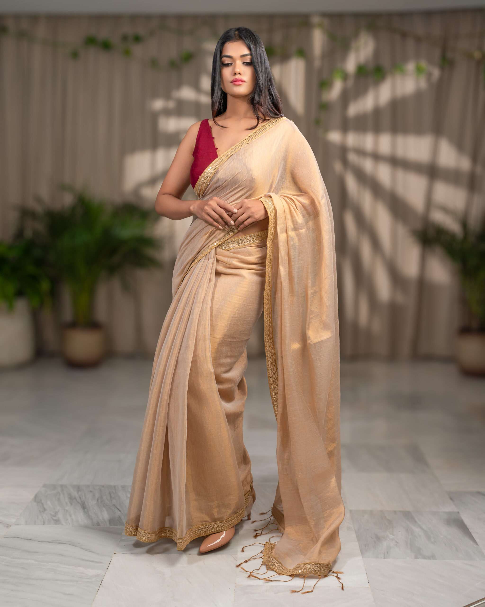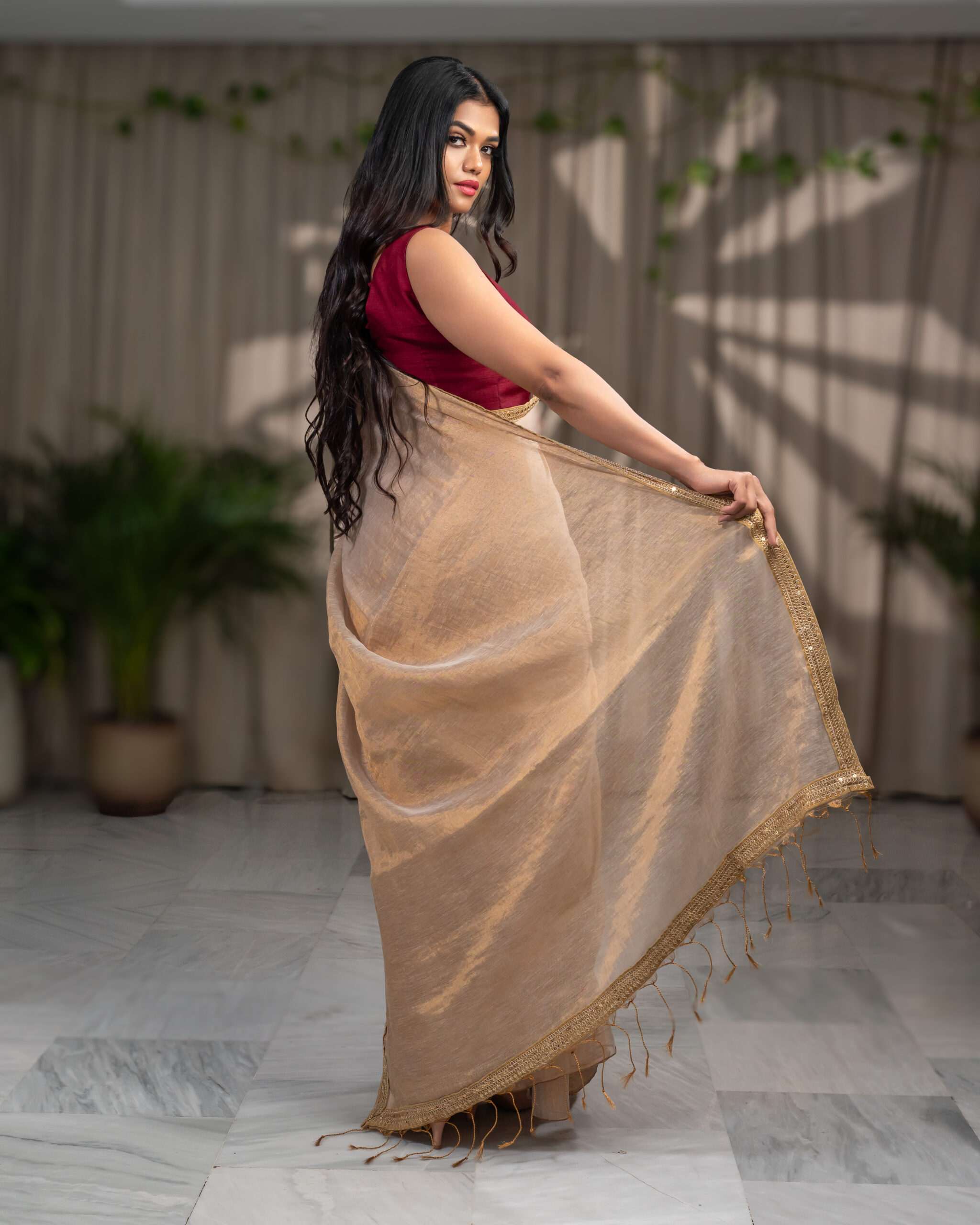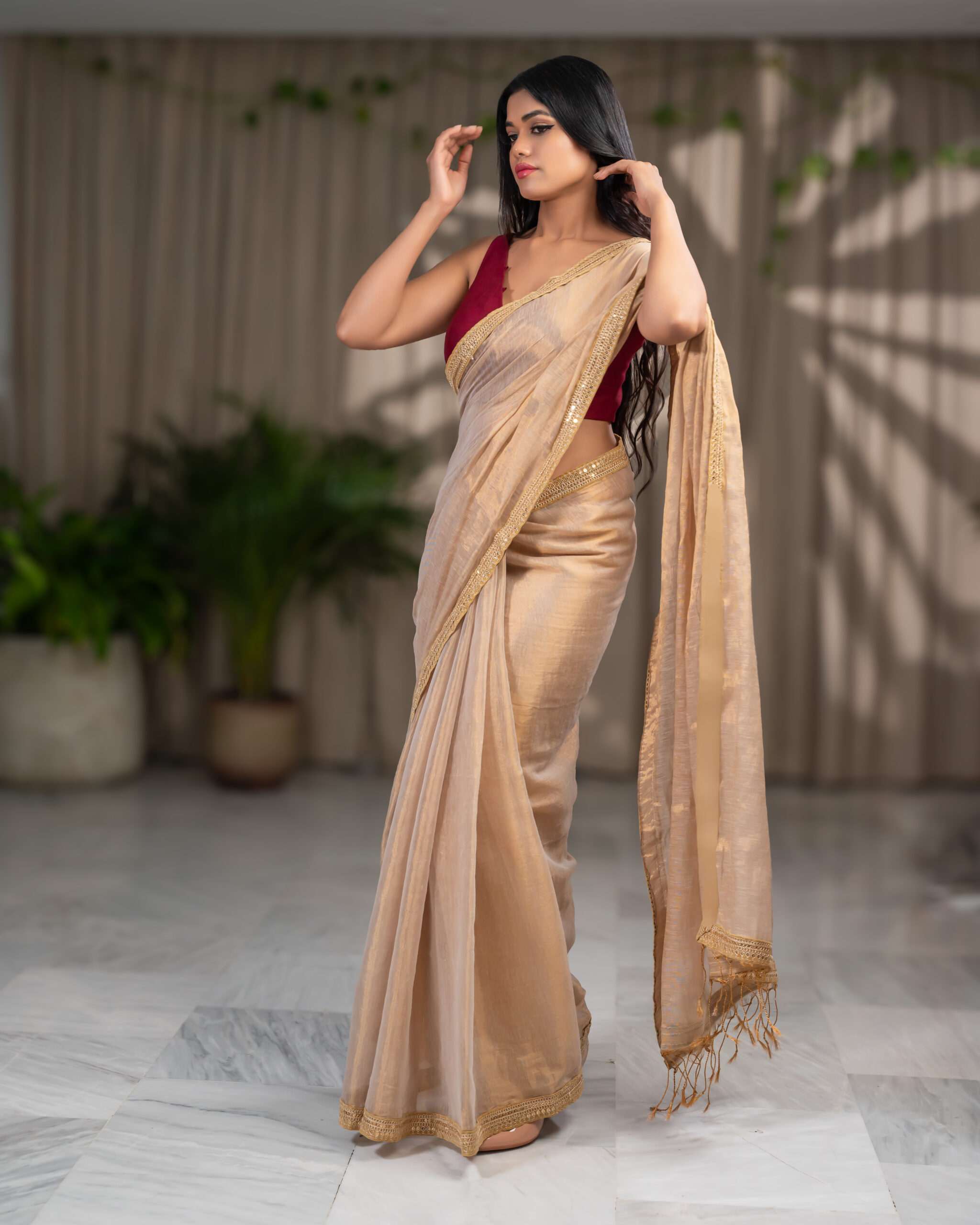 Golden Elegance: Raga Tissue Saree with Golden Lace