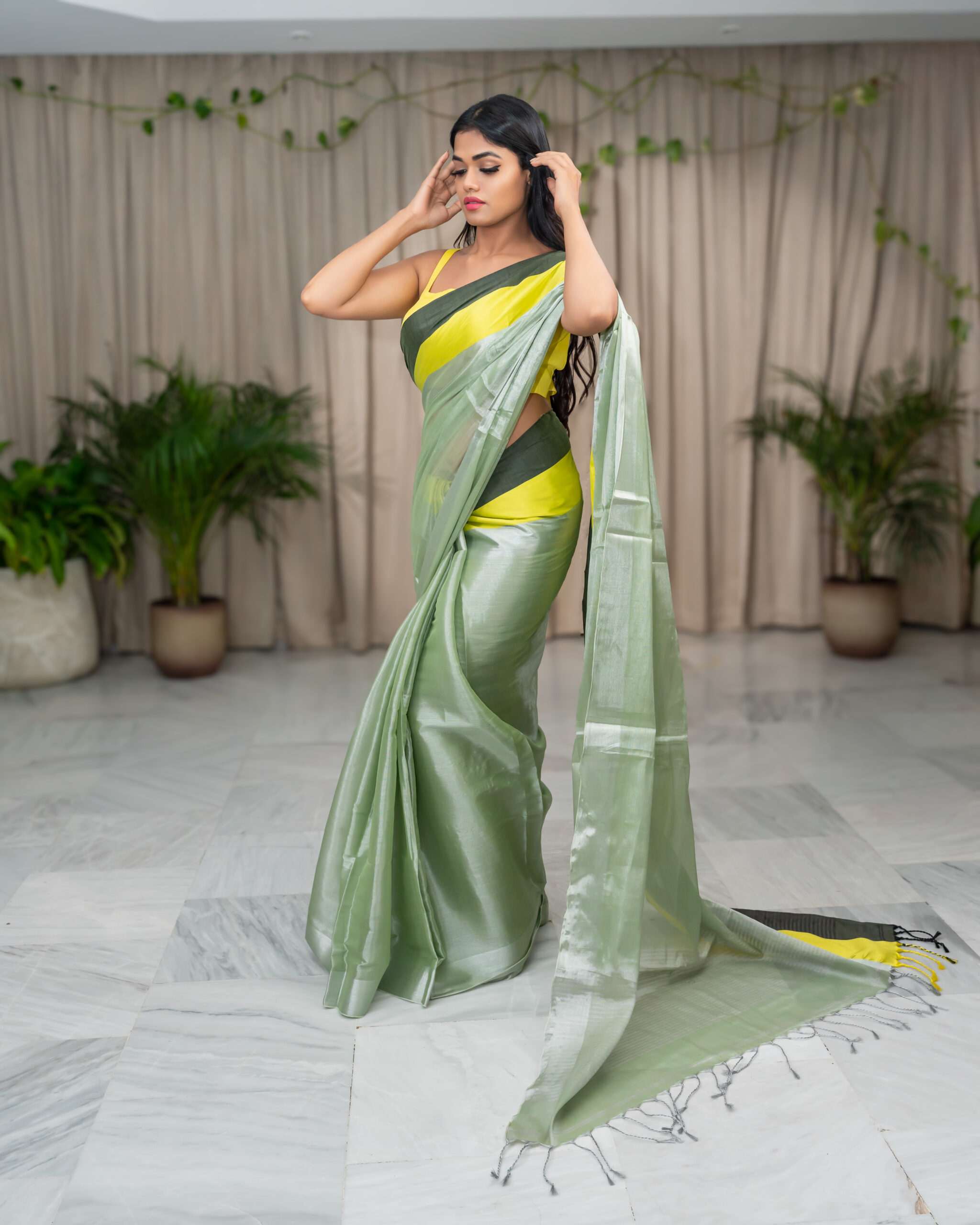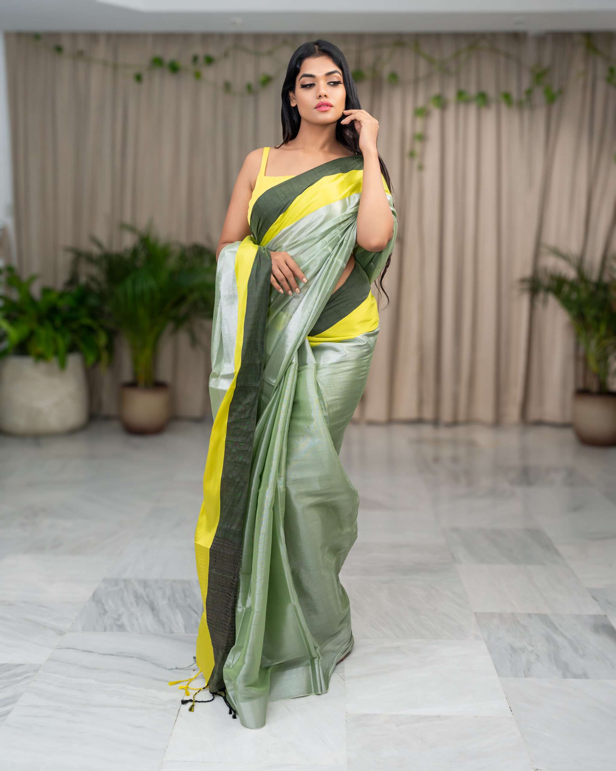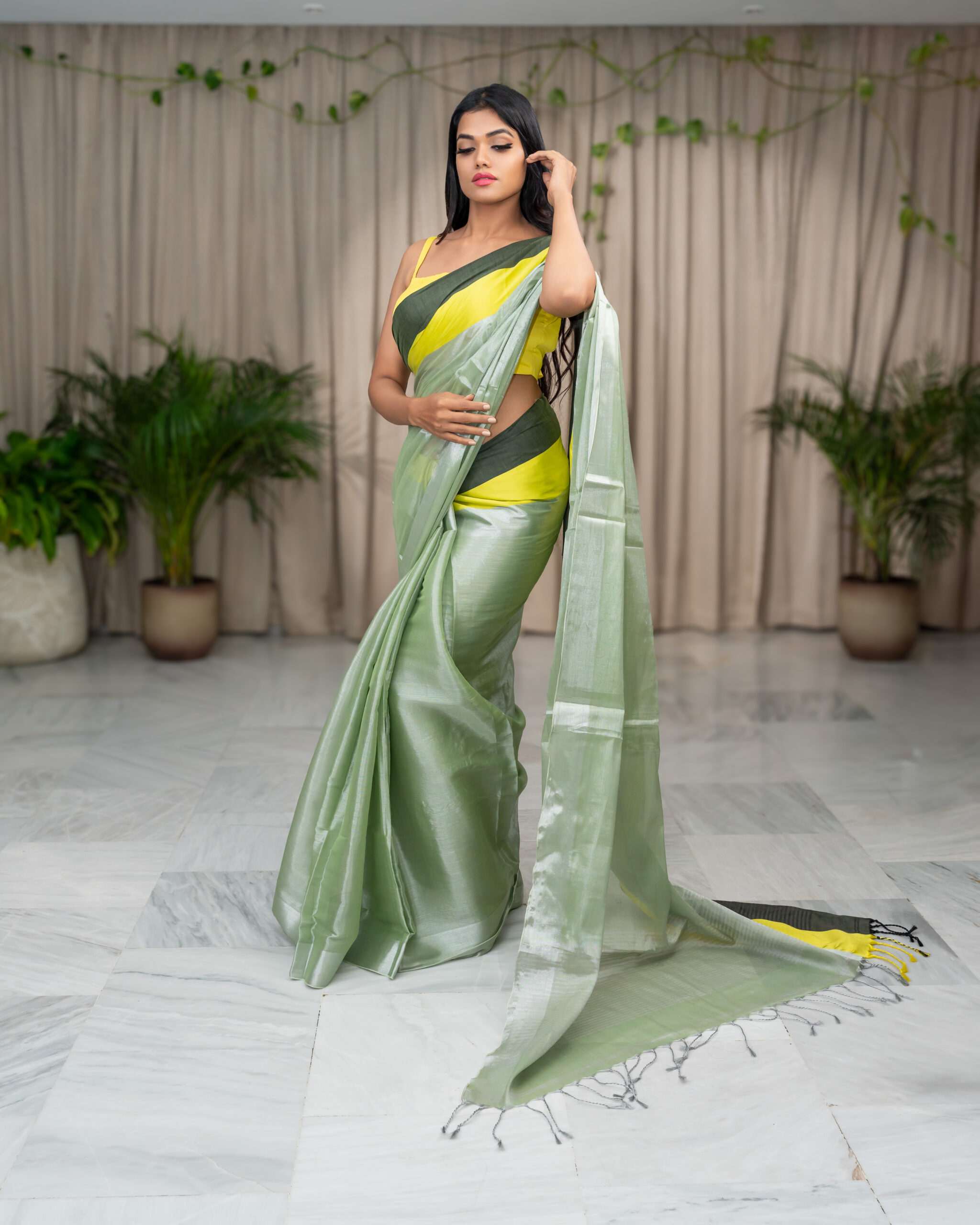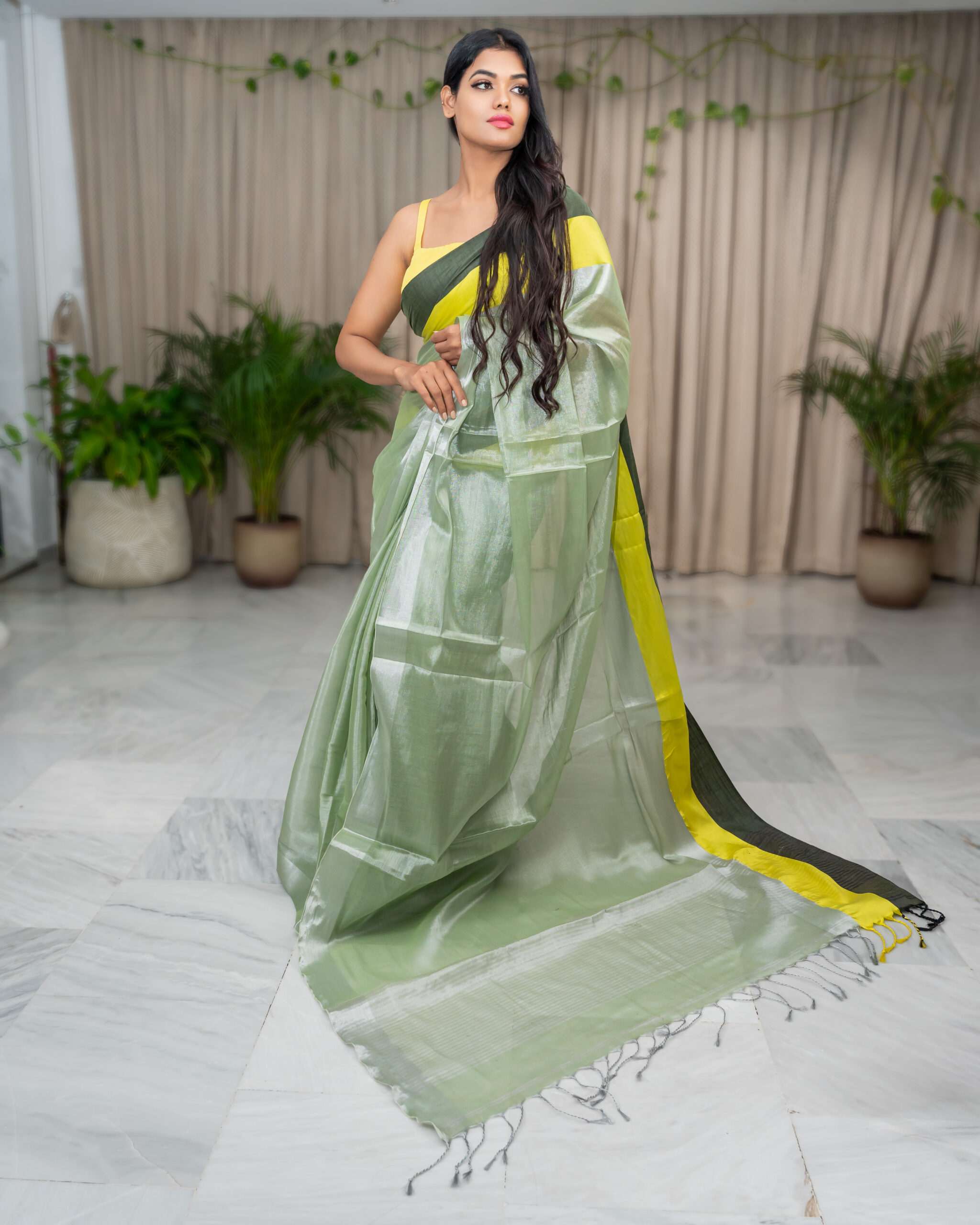 Indulge in the elegance of our Pista Raga Tissue Saree. This stunning piece, crafted from the finest raga tissue, showcases a delicate pista green hue, beautifully complemented by a vibrant yellow and dark green border.