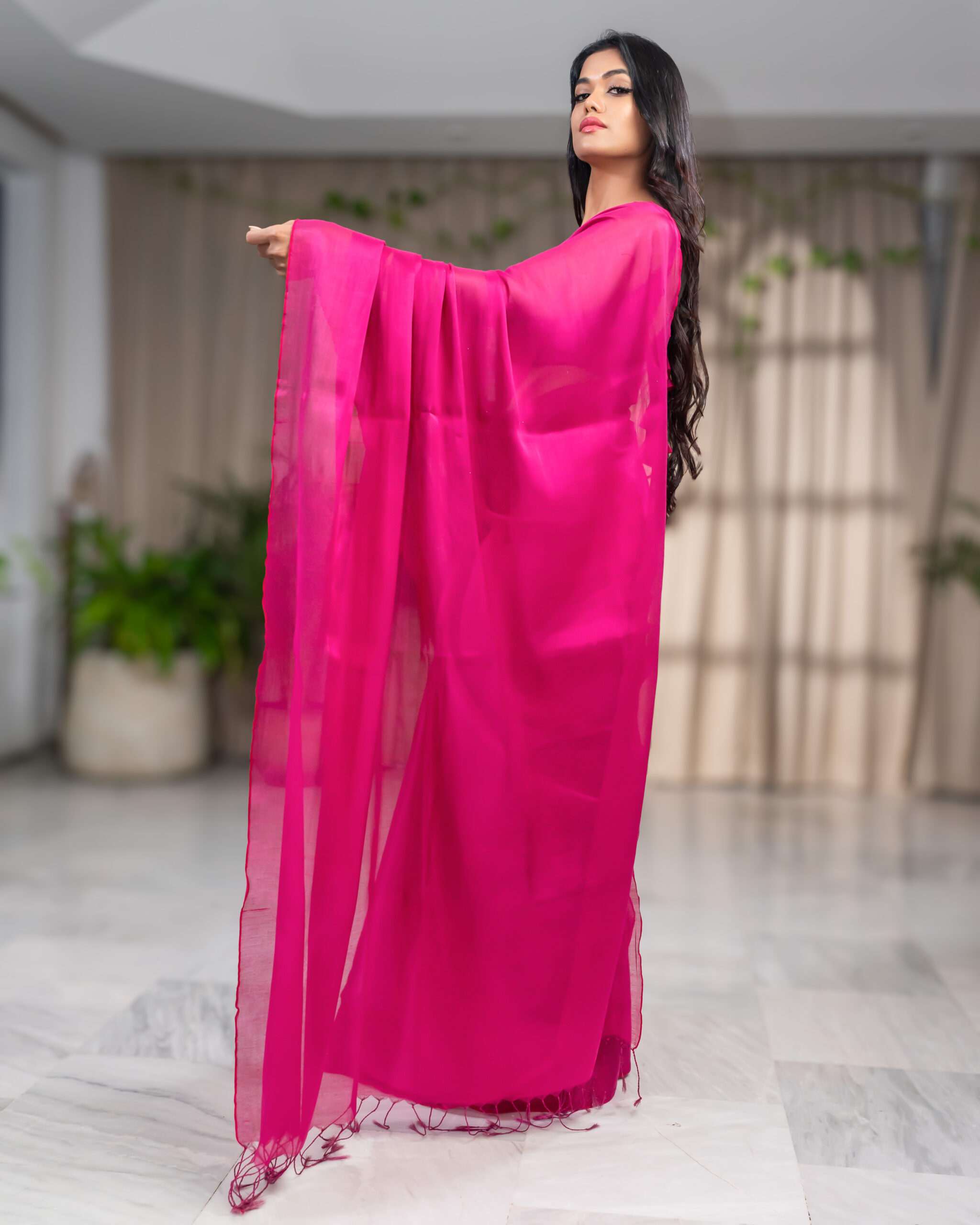 Experience the timeless beauty of our Plain Raga Tissue Saree. This minimalist masterpiece, crafted from the finest raga tissue, showcases a delicate pink hue, perfect for any occasion.
