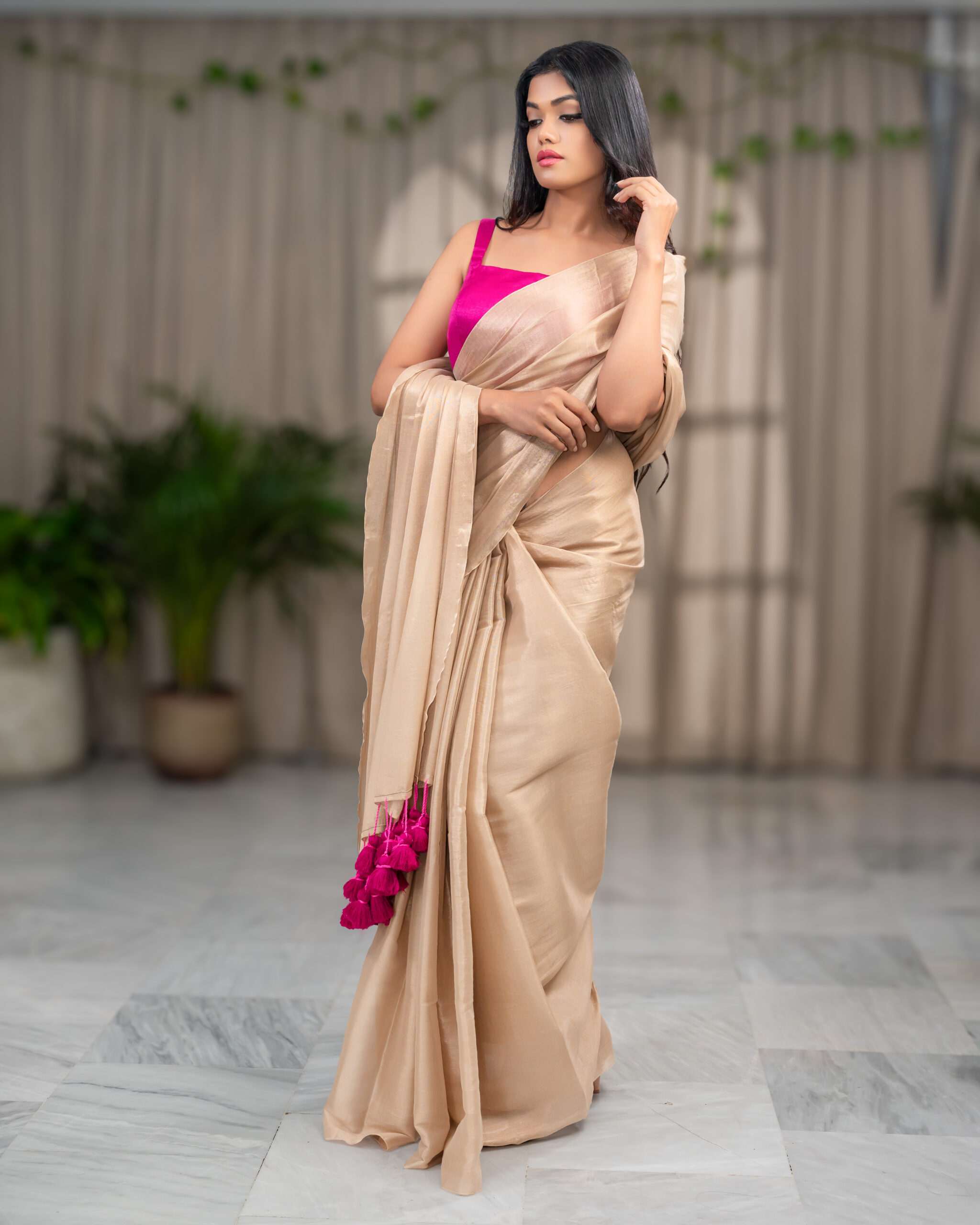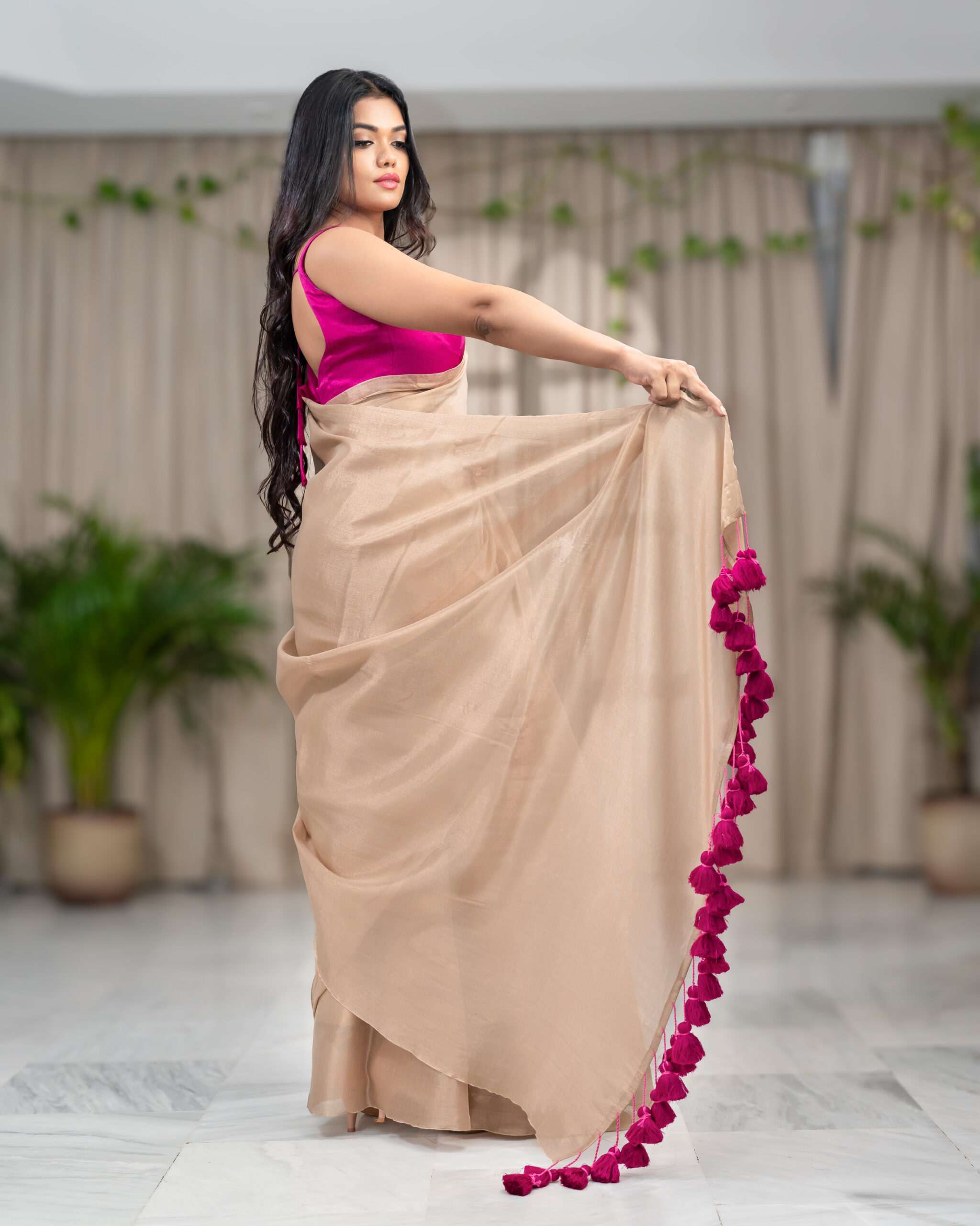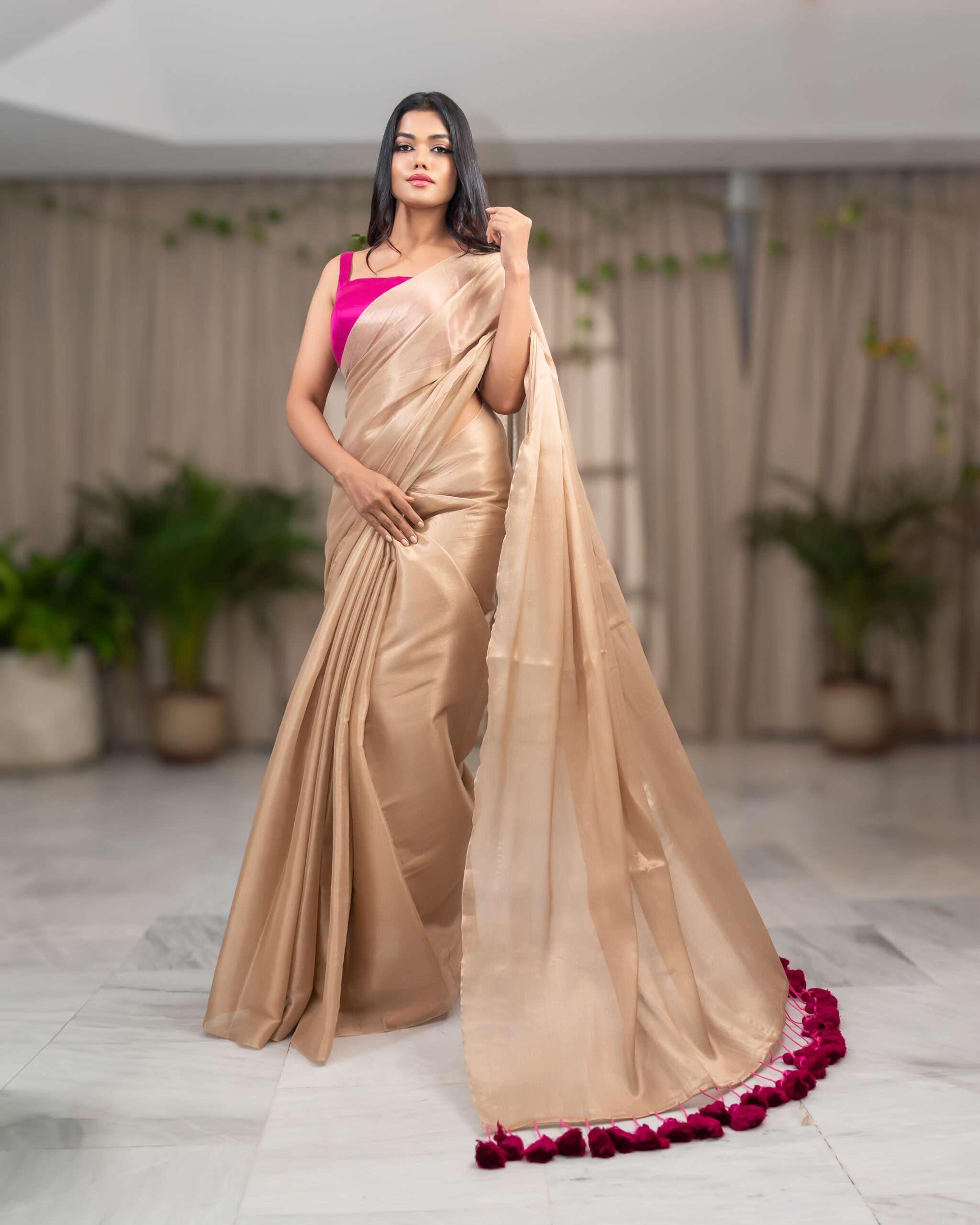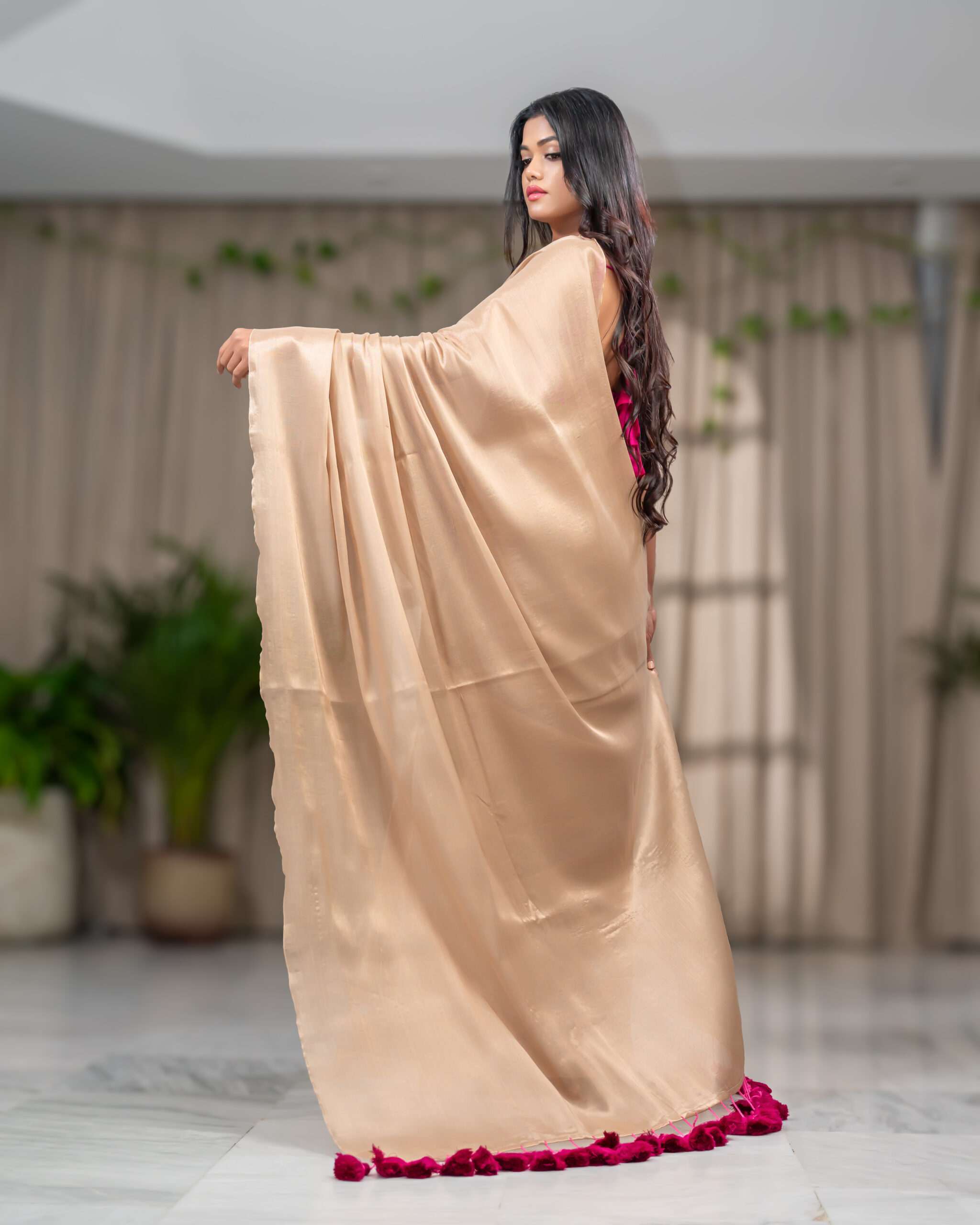 Experience the simplicity of elegance with our Plain Raga Tissue Saree. This minimalist masterpiece, crafted from the finest raga tissue, showcases a beautiful beige hue and is adorned with eye-catching big pink pom-poms.