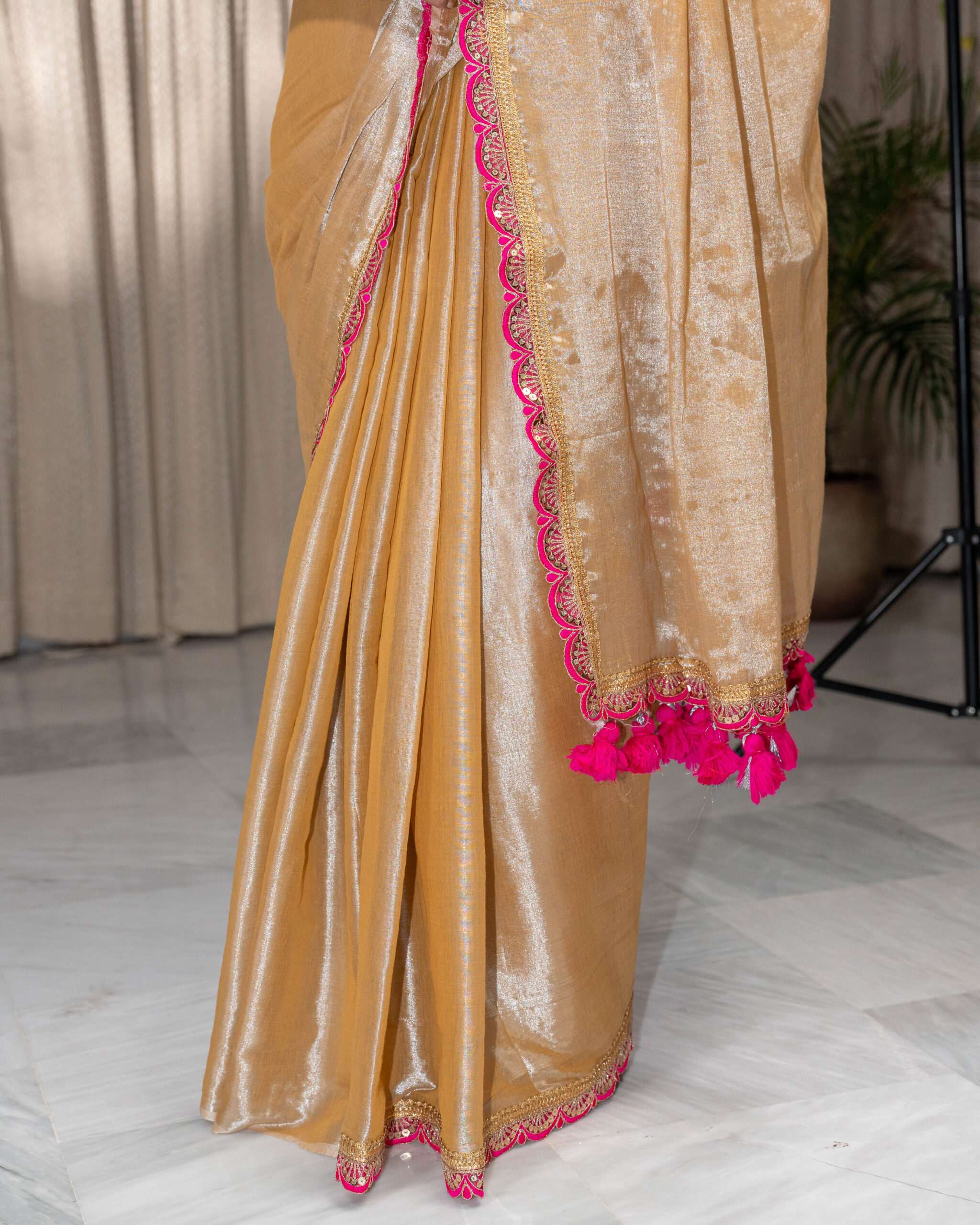 Indulge in the ethereal beauty of our Raga Tissue Saree. This exquisite piece, adorned with a delicate pink lace border and big pom-poms, exudes a captivating charm.