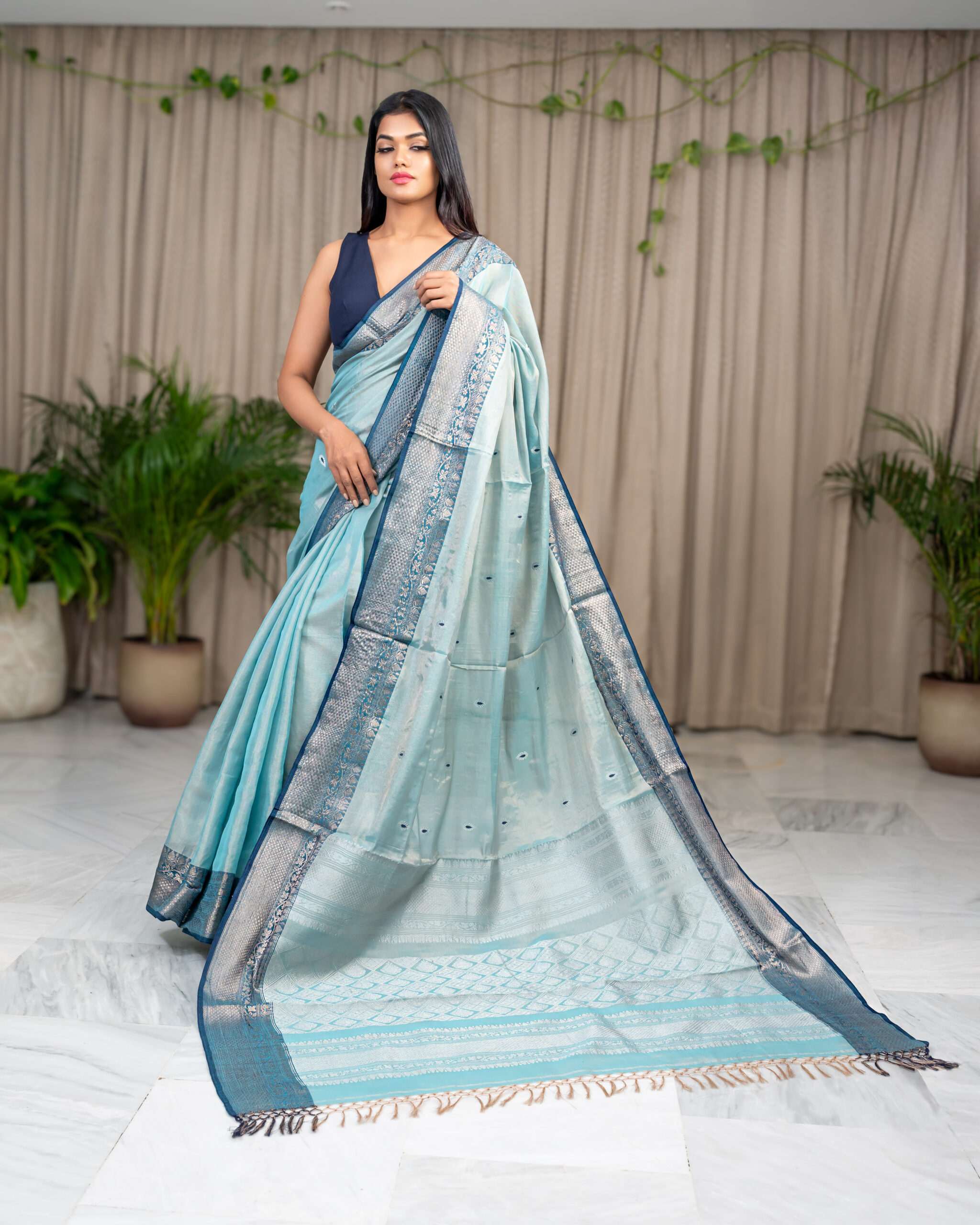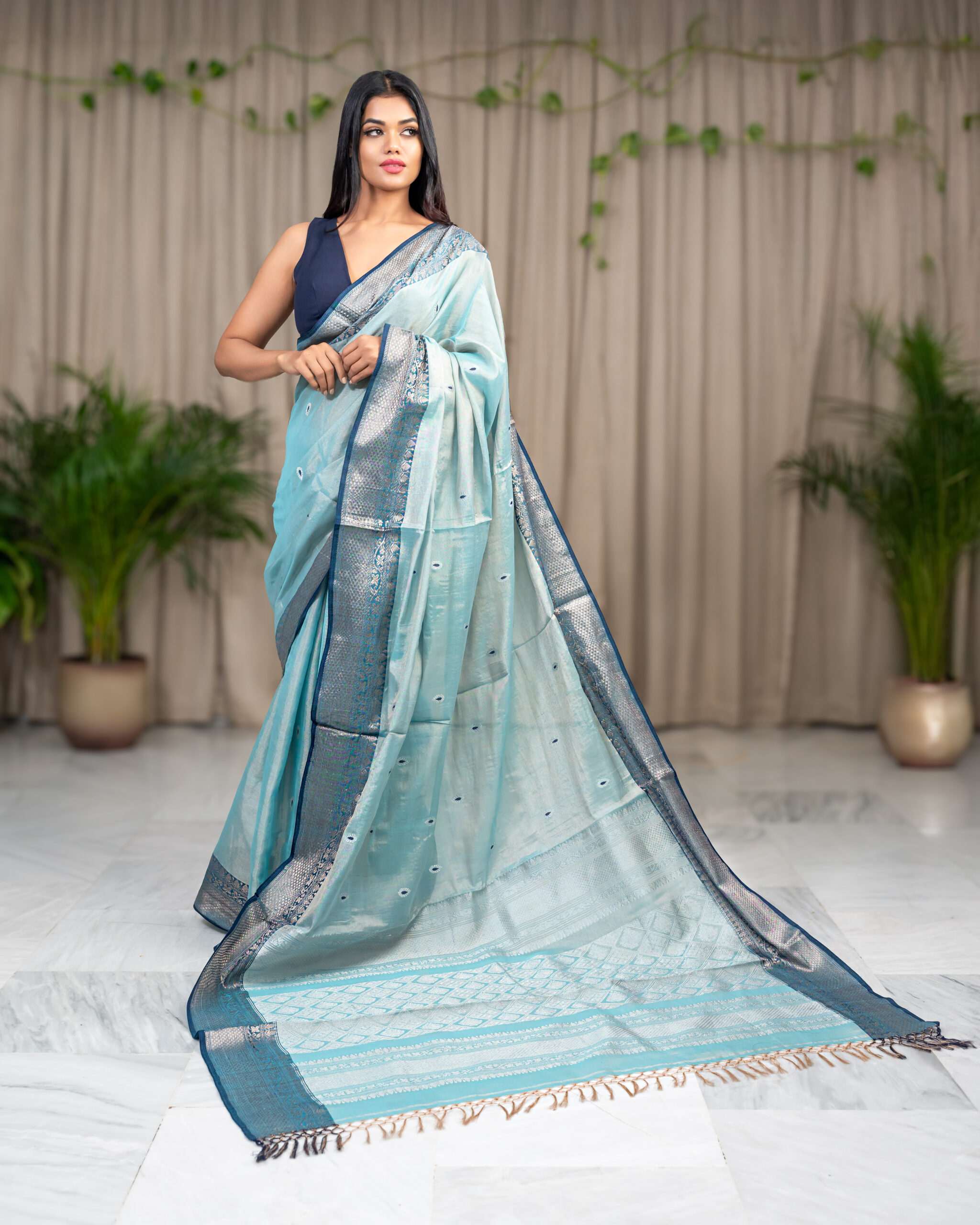 Experience the exquisite artistry of our Raga Tissue Bhunjodi Saree. This stunning piece, meticulously handwoven, showcases a serene sky blue hue, beautifully complemented by a shimmering silver zari border.