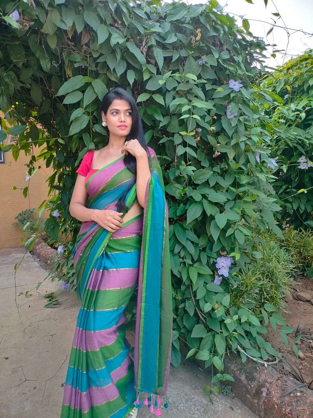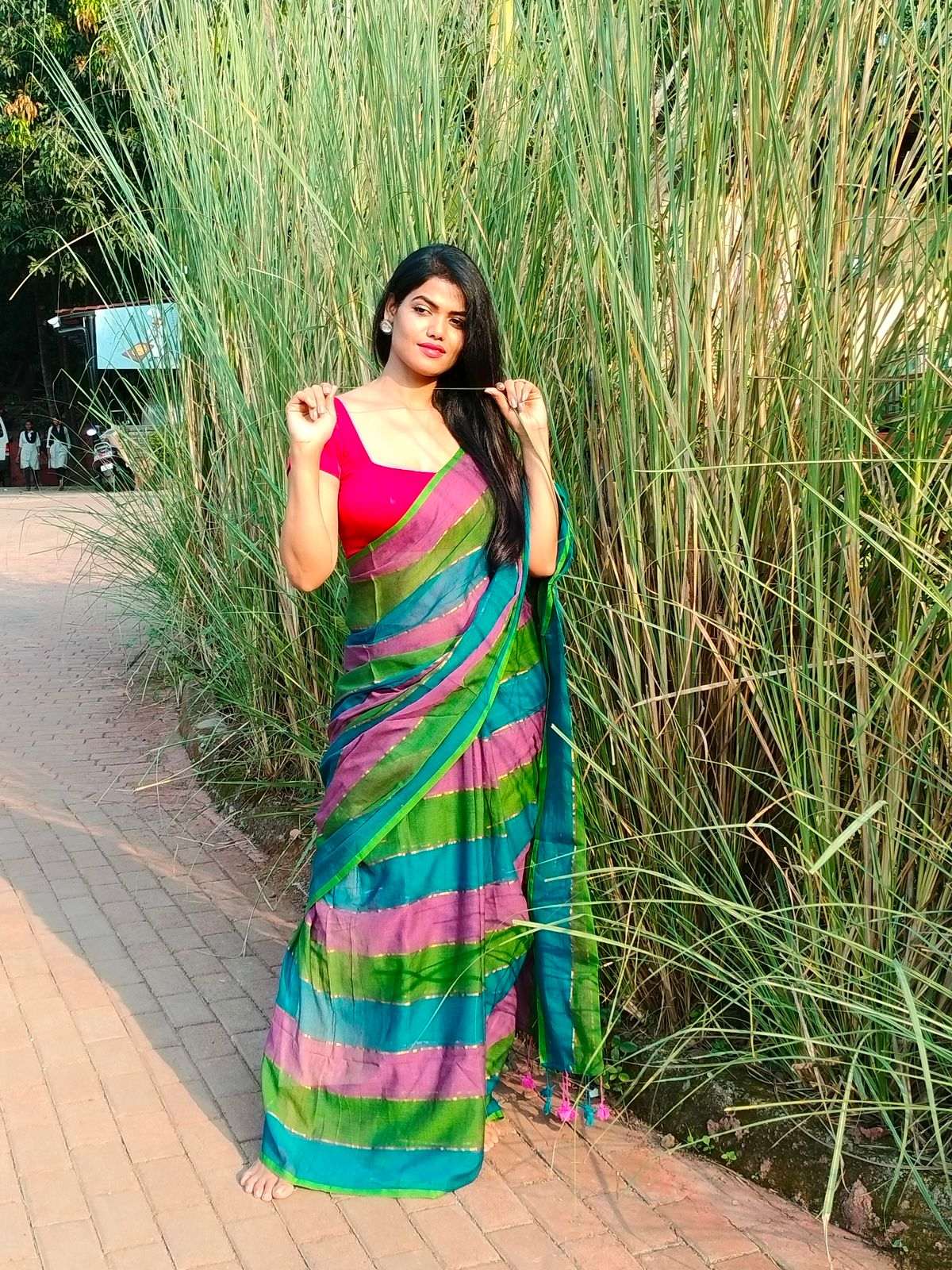 Eye-Catching Multi-Color Stripes: The highlight of this saree is the vibrant use of colorful stripes. These stripes can be thin or thick, and can come in a variety of color combinations. The playful pattern adds a touch of fun and informality to the saree, making it perfect for casual occasions, festive events, or even as a summer staple.