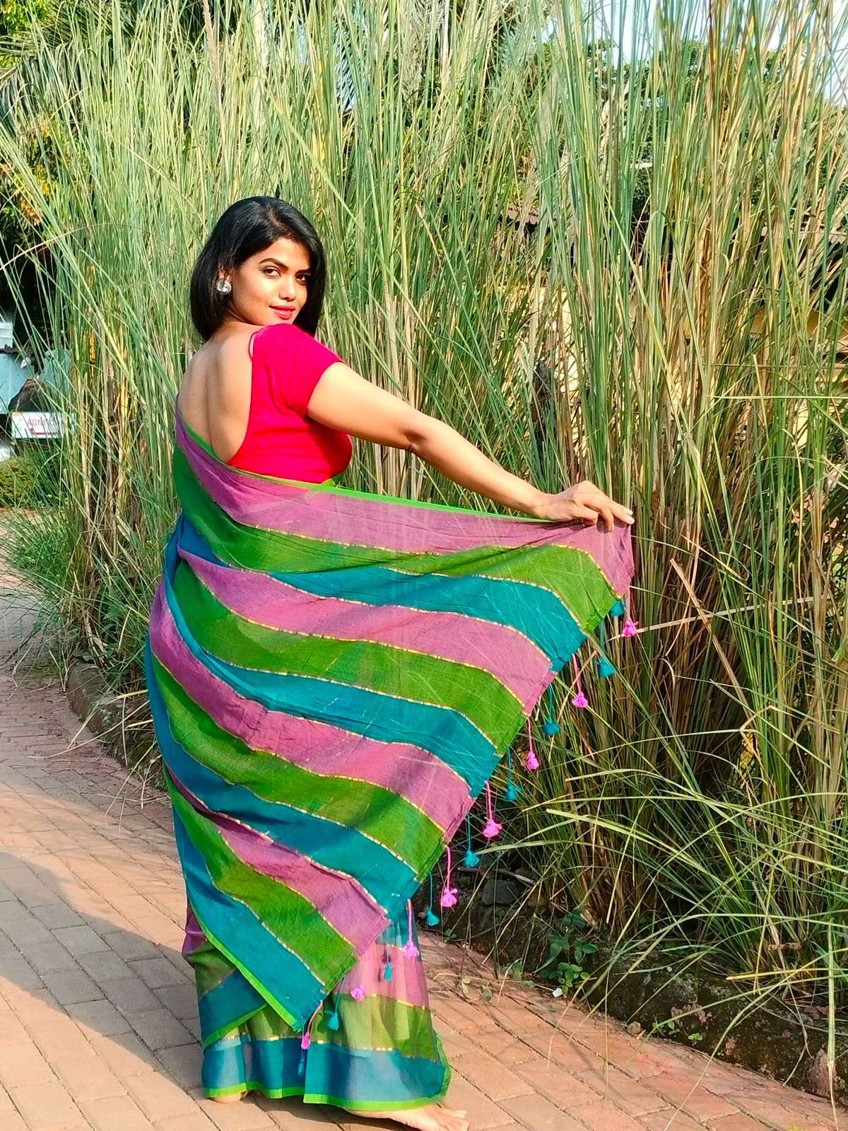Comfortable and Stylish: This saree’s beauty lies in its perfect blend of comfort and style. The Mal cotton base ensures all-day comfort, while the colorful stripes add a unique flair. You can dress it up with heels and statement jewelry for a playful yet fashionable look.