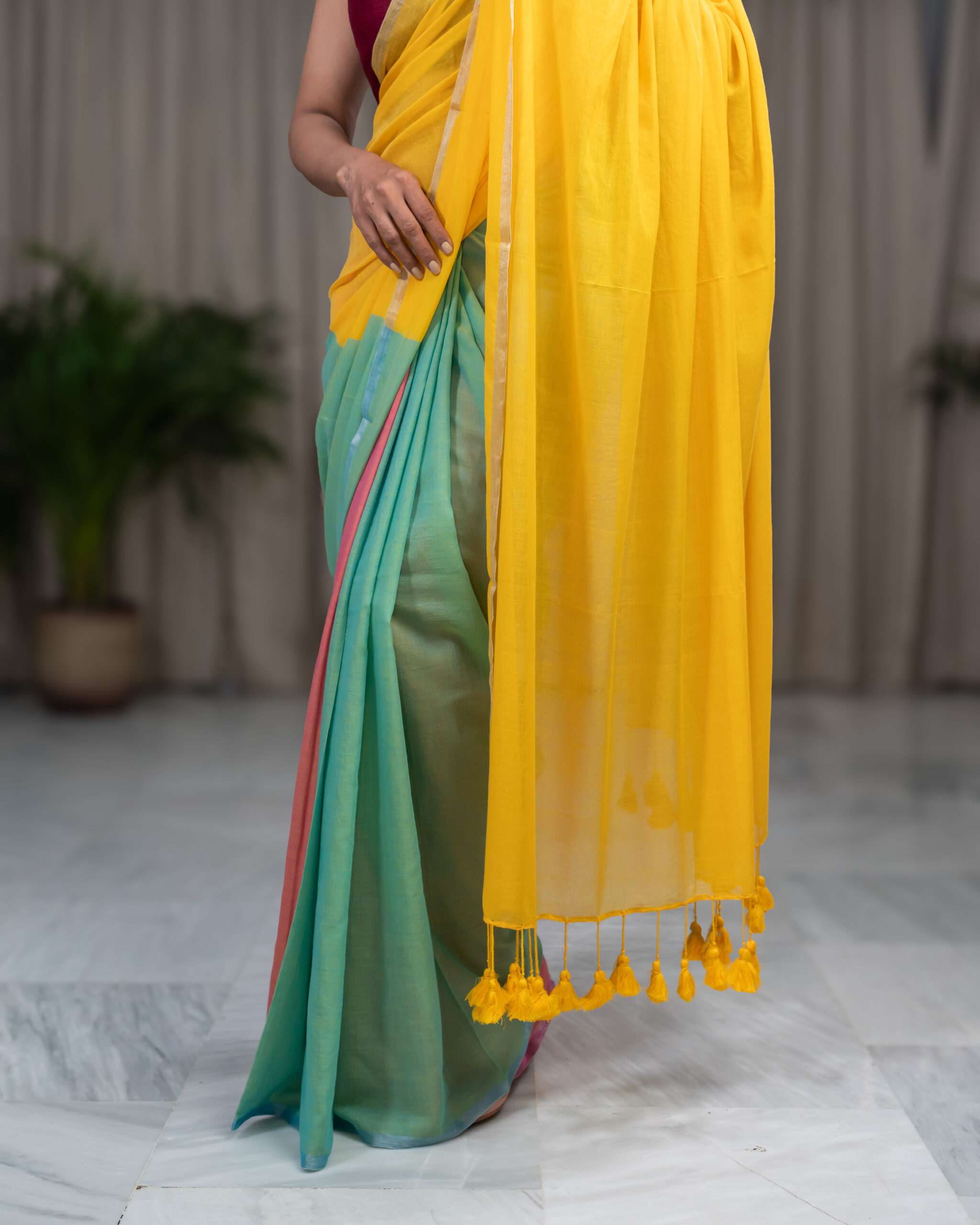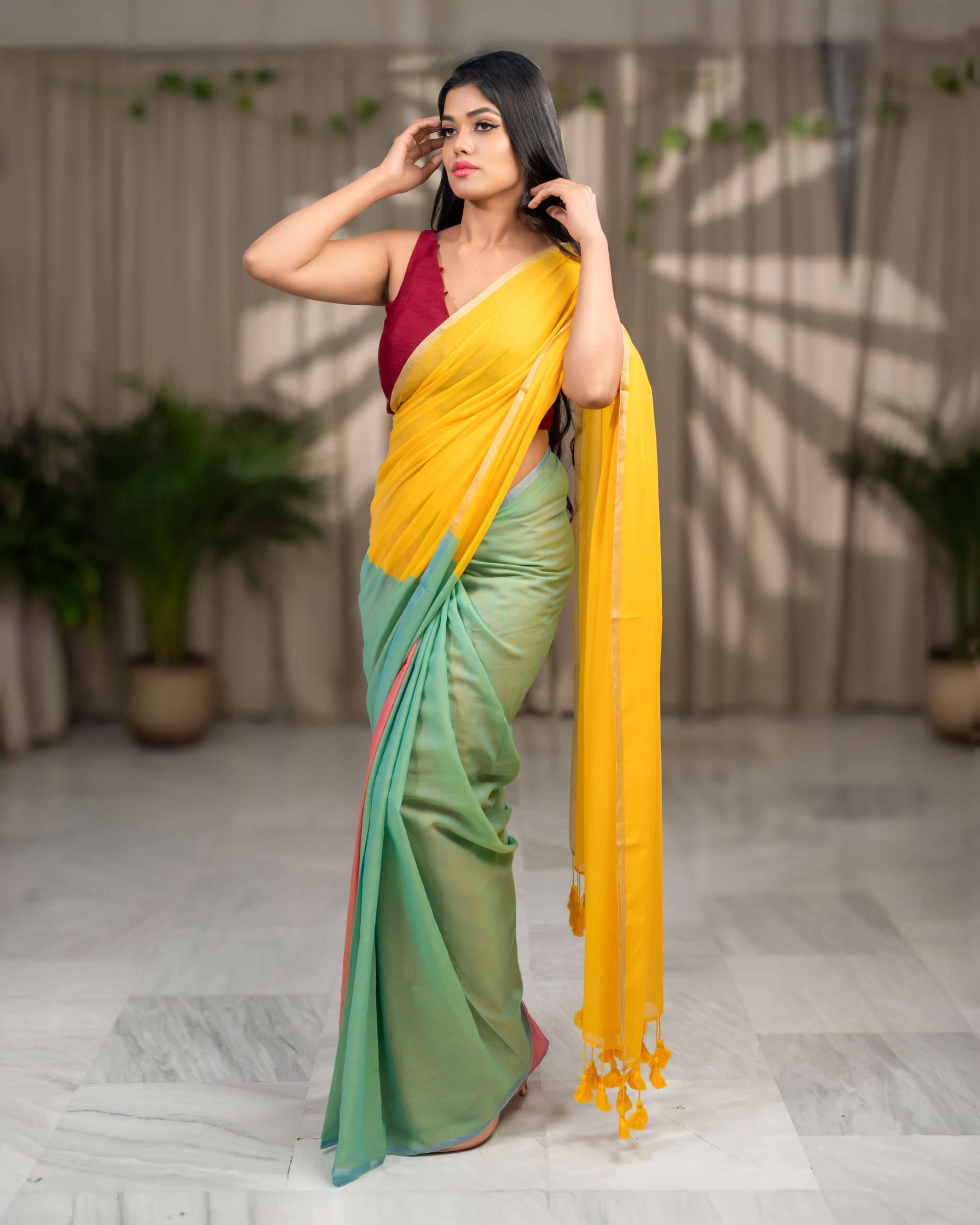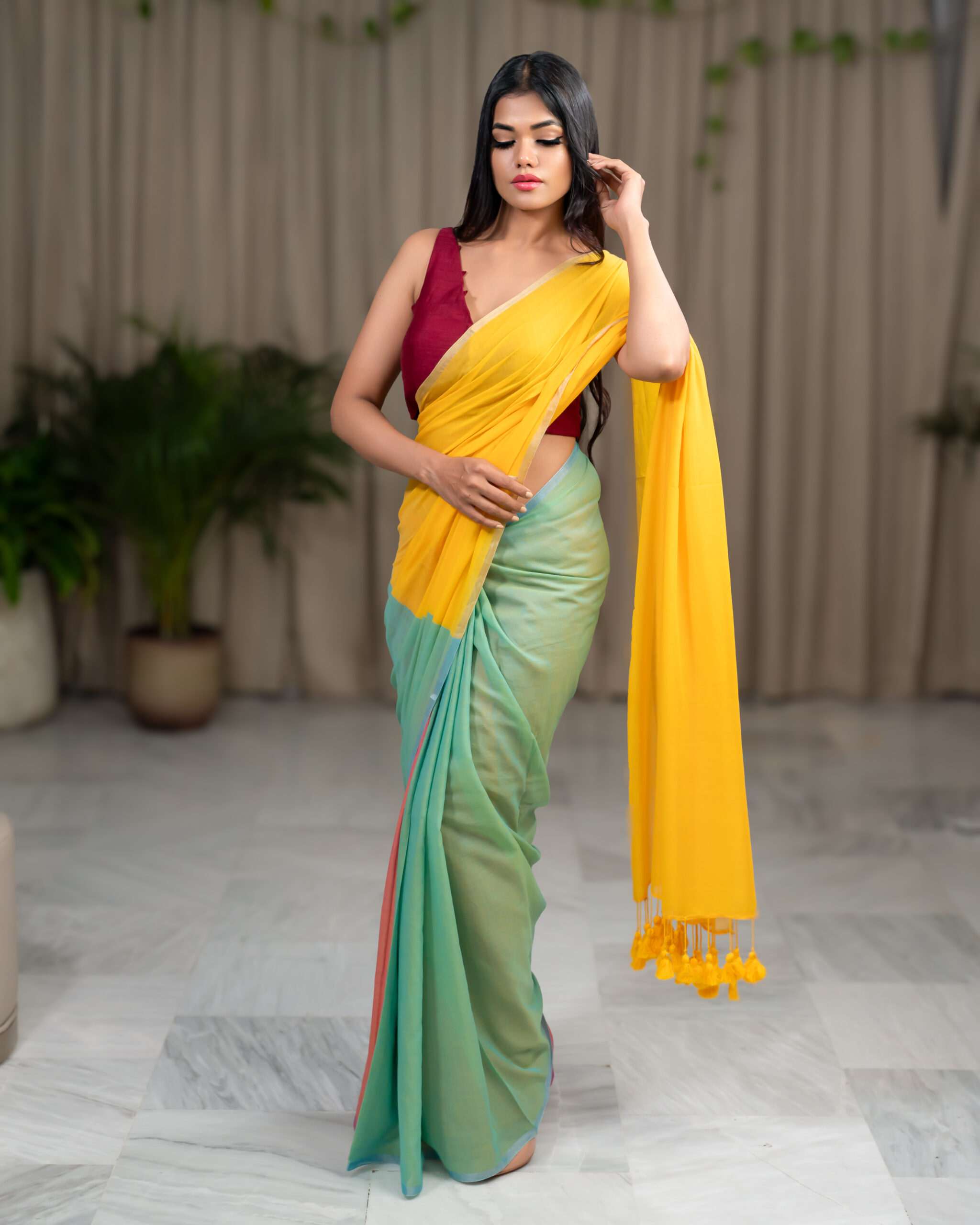 Experience the vibrant charm of our Multi-Color Cotton Saree. This stunning piece, crafted from soft and breathable cotton, features a captivating blend of green and yellow hues.